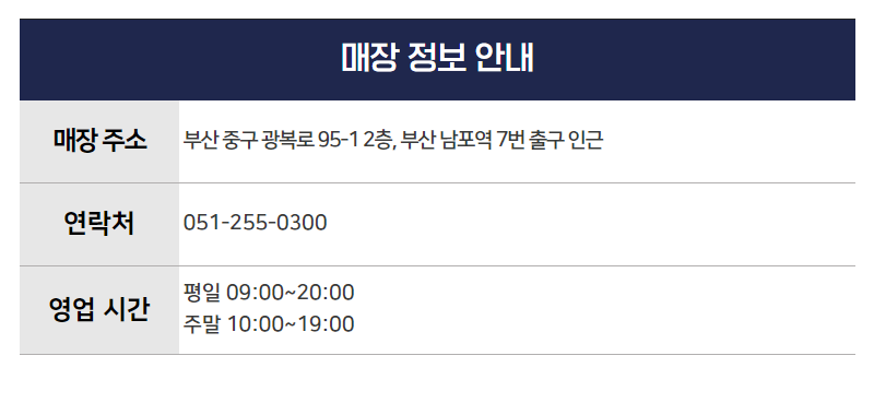 * 주소 : 부산시 중구 광복로 95-1 2층 (부산 남포역 7번 출구 인근)