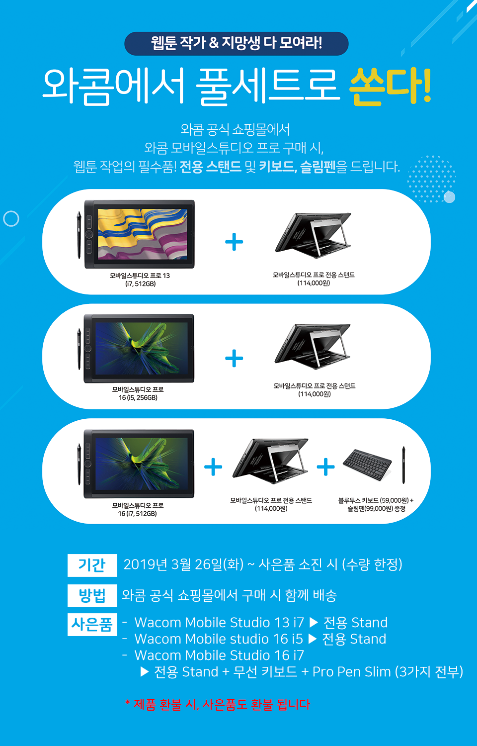 와콤 모바일스튜디오 프로 구매자를 위한 특별한 이벤트를 실시합니다. 와콤 공식 쇼핑몰에서 와콤 모바일스튜디오 프로 제품을 구매하면 약 12만원 상당의 전용 스탠드, 6만원 상당의 블루투스 키보드, 10만원 상당의 슬림펜 등 창작 작업에 꼭 필요한 액세서리를 사은품으로 증정합니다. 이벤트는 사은품 소진 시까지 진행되고, 제품 환불 시 사은품도 환불됩니다. 액정 타블렛 구매를 고려하고 있다면, 이번 득템 찬스를 노려보시길 바랍니다 :)