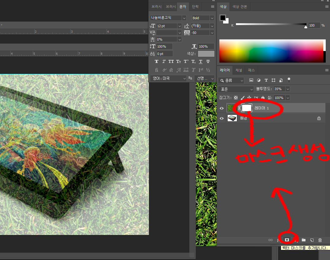 이 상태에서 오른쪽 레이어 팔레트 아래에 있는 '마스크' 모양을 눌러줍니다. (사각형안에 원이 들어있는 카메라같은 아이콘) 그럼 잔디 배경 레이어 옆에 흰색의 배경이 하나 더 생기는데요.