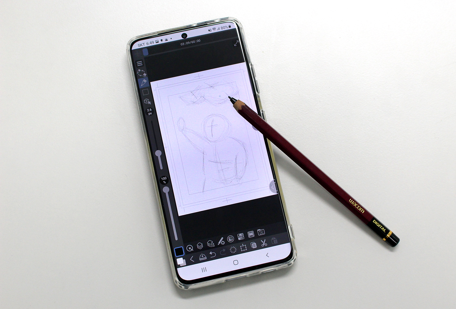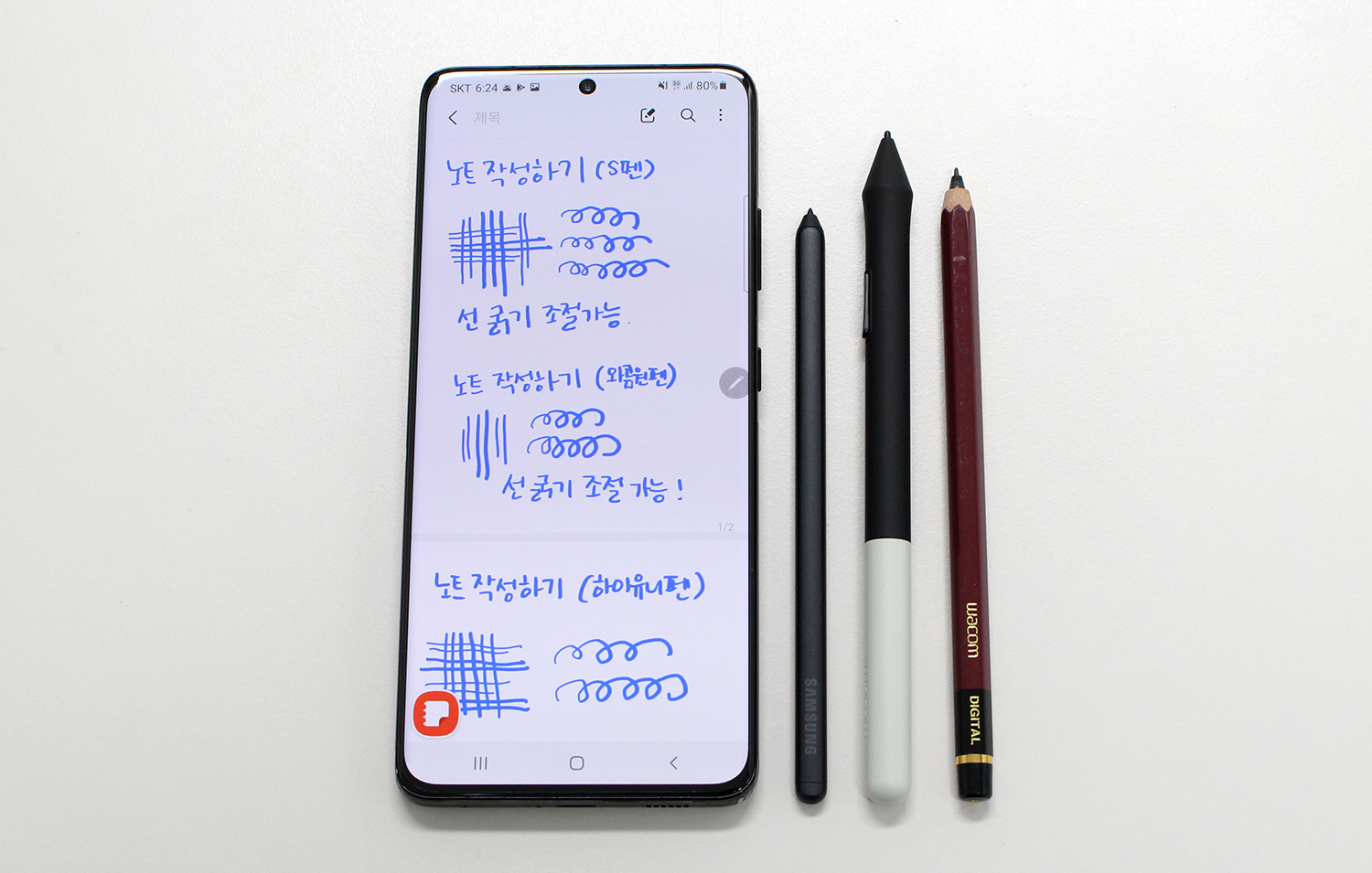 먼저 와콤 원 펜은 손으로 쥐었을 때 가장 적당한 두께와 무게를 갖췄습니다. S펜보다 도톰해보이는 펜촉은 오히려 갤럭시S21 울트라 화면에 미끄러짐 없이 세밀한 필기와 드로잉을 가능하게 합니다.