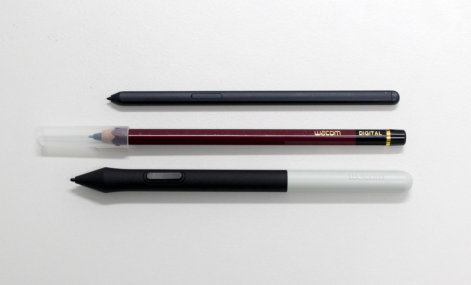 반면, 와콤 하이유니 디지털 펜은 버튼은 없지만 아날로그 연필 특유의 익숙한 디자인과 그립감을 그대로 재현해 필기하는 즐거움을 고스란히 느낄 수 있는 펜입니다.