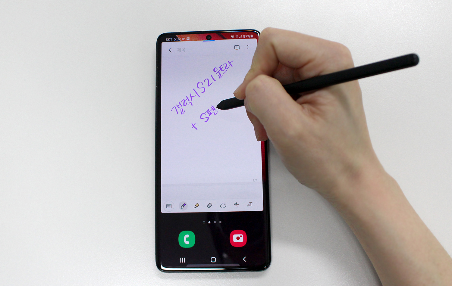 갤럭시S21 울트라에 지원되는 S펜은 노트 시리즈의 S펜처럼 빠르게 노트를 작성하고, 캡쳐 이미지 위에 주석 및 메모를 남기거나, 라이브 메시지를 보내는 등 다양한 기능을 지원해 매우 편리합니다. 부드럽고 탄성이 있는 뾰족한 펜촉 덕분에 세밀한 표현도 가능하고요.