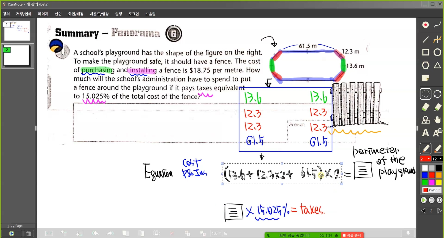 디지털 판서 프로그램은 아이캔노트를 사용해요. 문제 풀이 과정은 녹화를 하고요, 수업이 끝나면 녹화된 화면과 아이캔노트에 적은 필기를 학생들에게 전달하면서, 좀 더 쉽게 복습할 수 있도록 하고 있습니다.