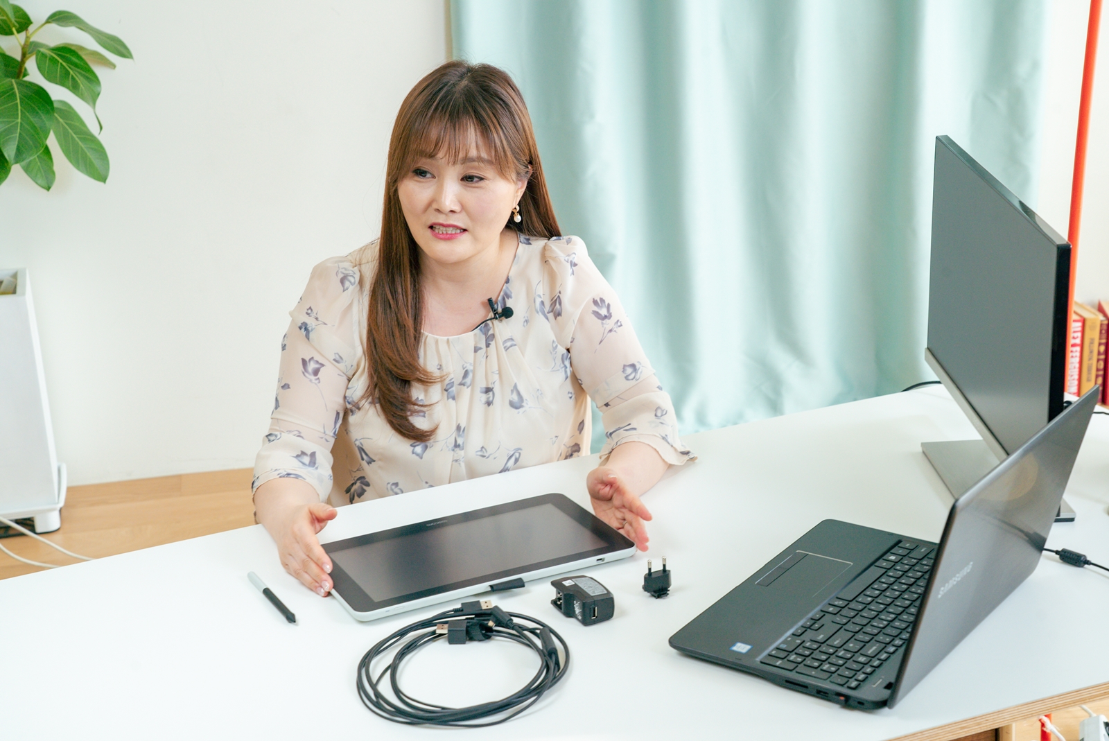 하지만 액정타블렛은 화면 위에 바로 작업을 할 수 있어서 쉽게 적응할 수 있습니다. 장은주 강사님은 와콤 원을 처음 써보고, 온라인 강의를 하는 선생님이나 재택근무를 하는 직장인들에게 딱 맞는 제품이라고 했는데요. 와콤 원은 교실 칠판에서 판서하는 것처럼 쉽게 글씨를 쓸 수 있고, 팜리젝션 기능을 지원해 손바닥을 화면에 대고 터치 펜으로 글씨를 써도 손바닥이 인식되지 않아서 자연스럽게 글씨를 쓸 수 있는 점이 장점이라고 언급했습니다.