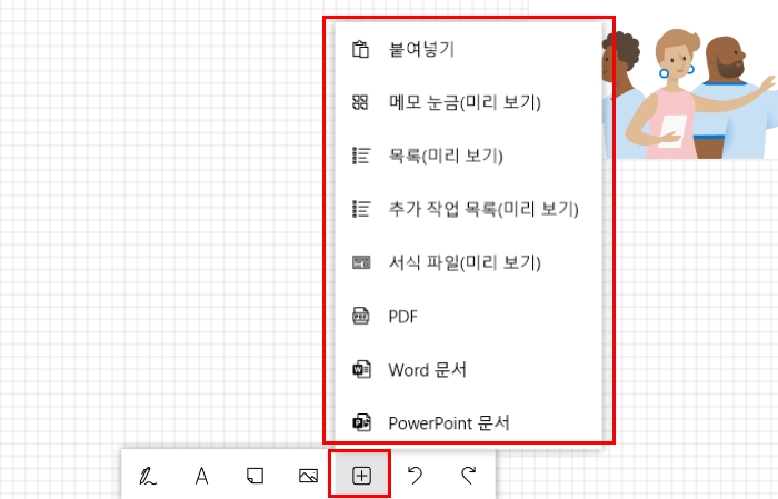 아이디어 회의가 끝났다면 보고용 자료를 만들거나, 회의 시 공유할 자료를 만들어야겠죠! 도구 모음 중 [삽입] 메뉴인 + 버튼에서 이미지나 워드, PDF, PPT파일 등을 추가하고 그 위에 주석을 달거나 메모를 할 수 있어 보다 상세한 자료를 만들 수 있습니다. 여러 요소들도 적절히 배치해 아이디어 스케치를 하거나, 업무 분배를 하는 등 다양하게 활용할 수도 있습니다. MS 화이트보드는 아이디어를 시각화하고 창의적인 작업을 돕는데 매우 유용한 디지털 캔버스 프로그램인데요. 무엇보다 매번 따로 저장을 누르지 않아도 모든 내용이 클라우드에 자동으로 저장되고, 언제든지 이어서 작업할 수 있어 편리합니다.