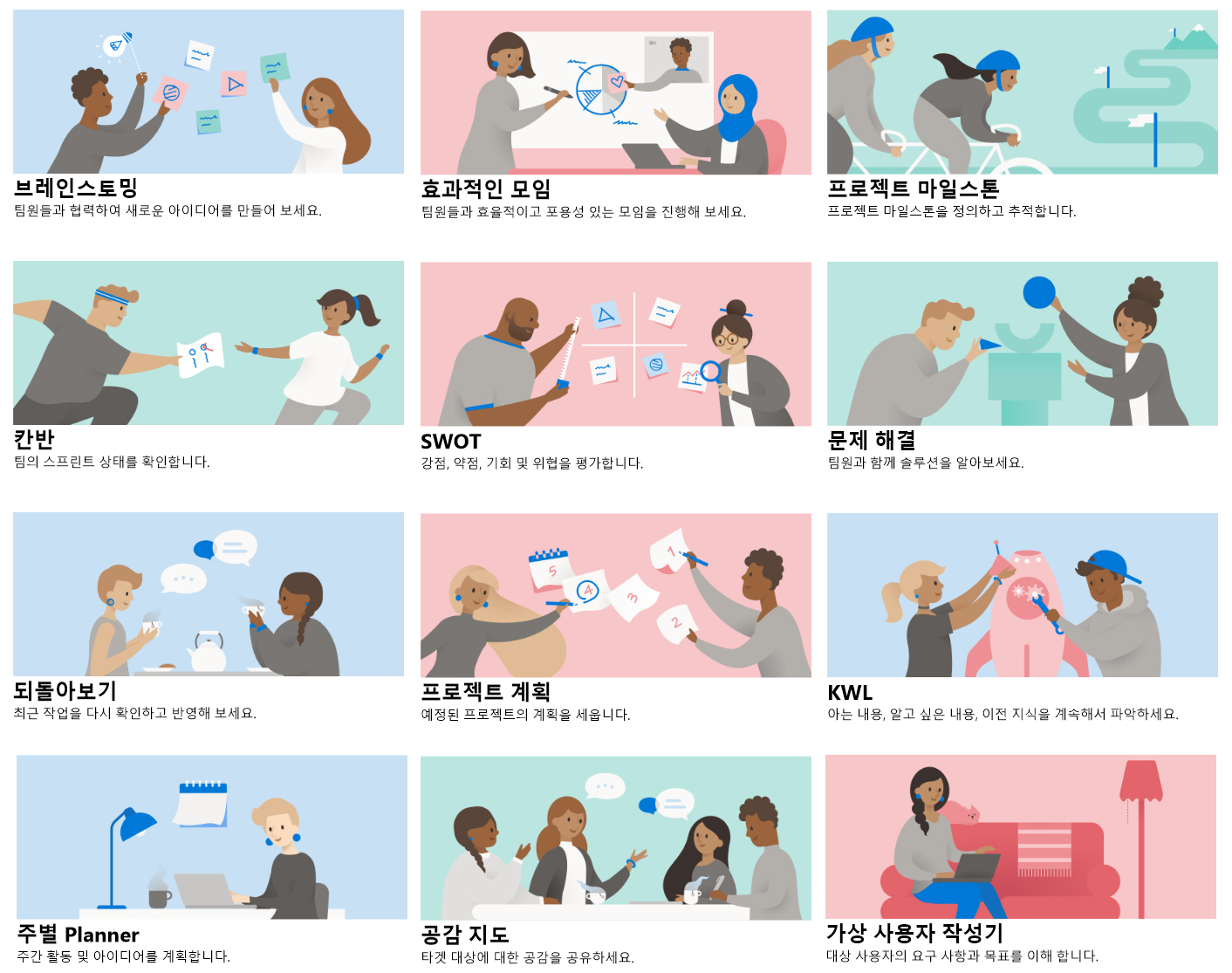 꼭 재택근무 중 회의 때뿐만 아니라 MS 화이트보드는 다양한 상황에 활용하기 좋은 프로그램인데요. 어떻게 활용하는 것이 좋을지 모르겠다면 제공되는 서식 파일을 이용해보는 것을 추천합니다. 브레인스토밍을 위한 서식, 팀원들과 솔루션을 도출하기 위한 서식, 프로젝트 계획을 세울 때 사용하면 좋을 서식, 주간 일정을 관리할 때 좋은 서식 등 유용한 서식을 간편하게 추가하고 이를 통해 체계적으로 업무를 진행해나갈 수 있습니다.