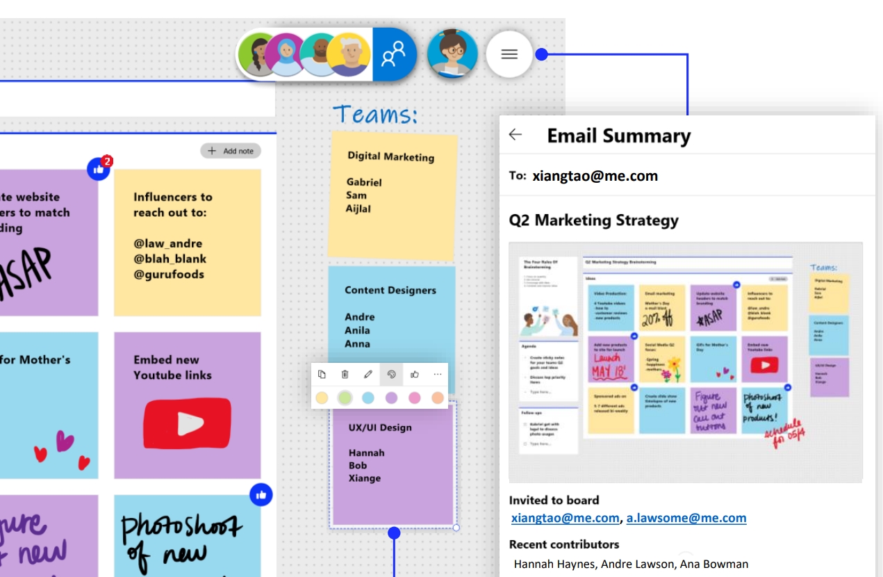 아이디어 회의가 끝났다면 보고용 자료를 만들거나, 회의 시 공유할 자료를 만들어야겠죠! 도구 모음 중 [삽입] 메뉴인 + 버튼에서 이미지나 워드, PDF, PPT파일 등을 추가하고 그 위에 주석을 달거나 메모를 할 수 있어 보다 상세한 자료를 만들 수 있습니다. 여러 요소들도 적절히 배치해 아이디어 스케치를 하거나, 업무 분배를 하는 등 다양하게 활용할 수도 있습니다. MS 화이트보드는 아이디어를 시각화하고 창의적인 작업을 돕는데 매우 유용한 디지털 캔버스 프로그램인데요. 무엇보다 매번 따로 저장을 누르지 않아도 모든 내용이 클라우드에 자동으로 저장되고, 언제든지 이어서 작업할 수 있어 편리합니다.