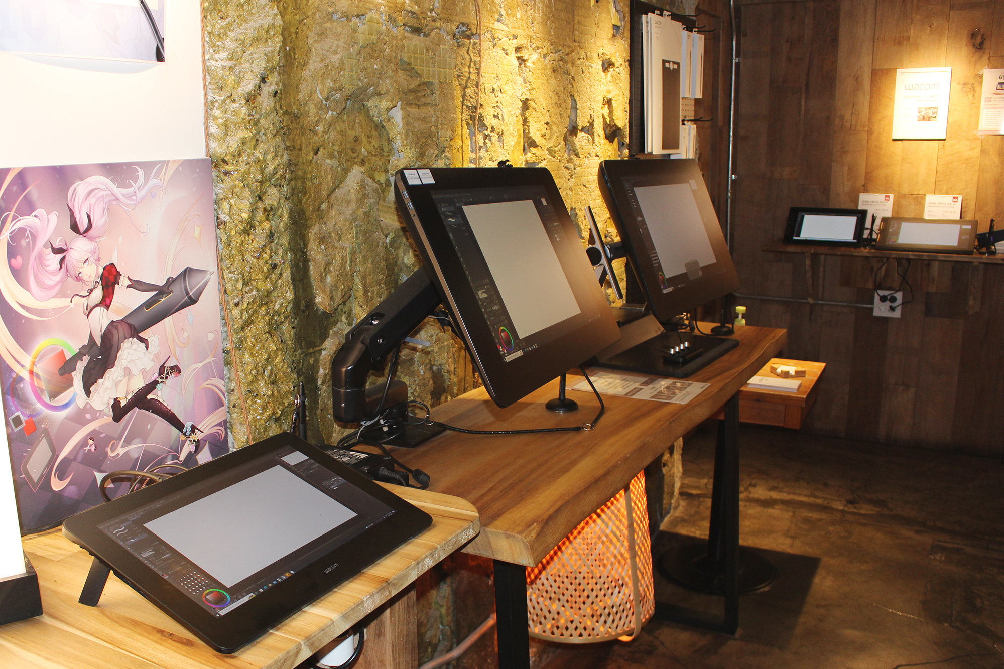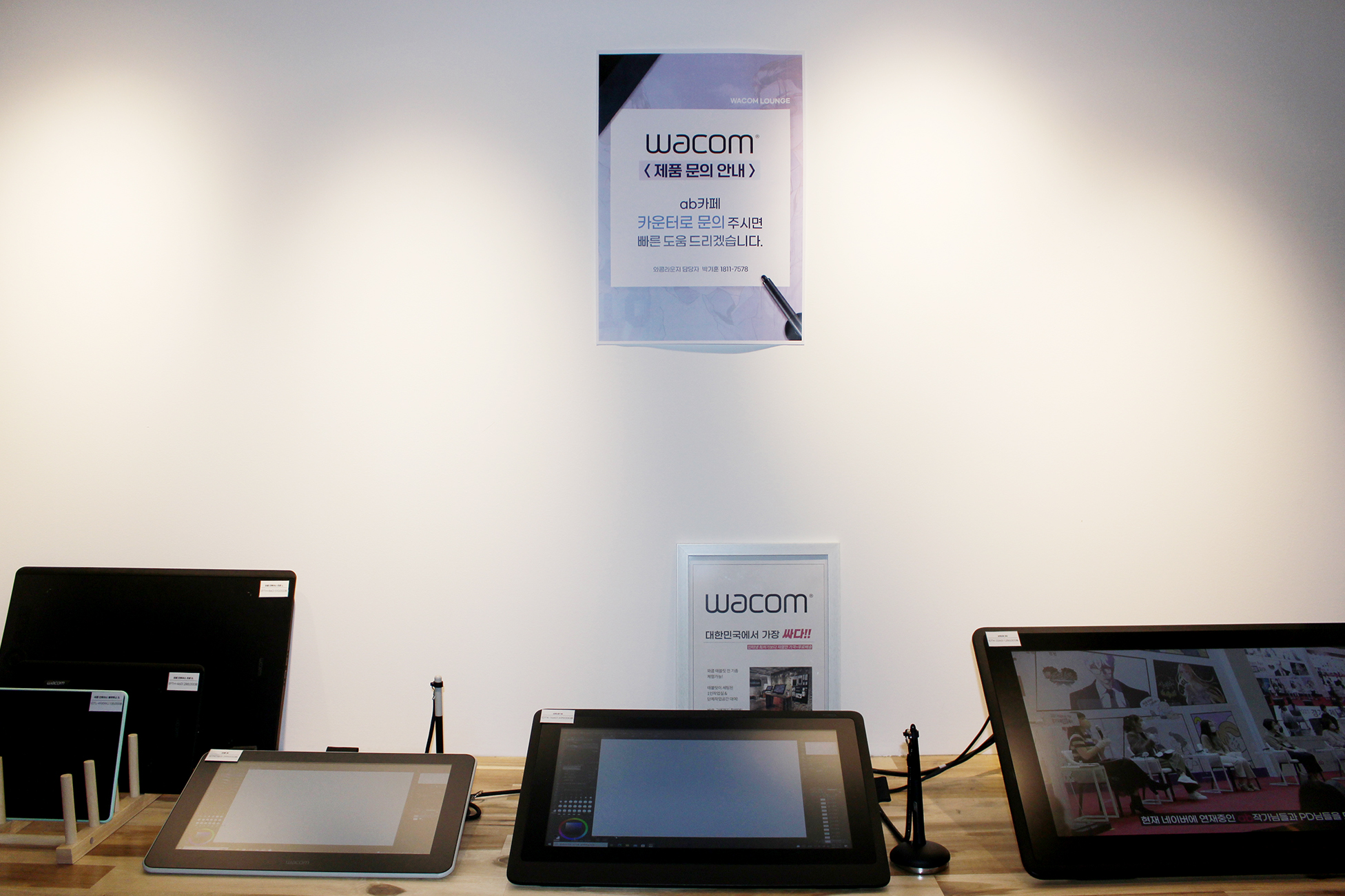 먼저 와콤의 전 제품을 체험해볼 수 있는 데모존부터 살펴볼게요. 와콤 인튜어스, 와콤 인튜어스프로와 같은 펜 타블렛부터 와콤 원, 와콤 신티크16, 와콤 신티크22, 와콤 신티크프로16, 와콤 신티크프로24 등의 액정 타블렛, 그리고 펜 컴퓨터인 와콤 모바일스튜디오프로까지 모든 제품이 진열되어 있습니다.