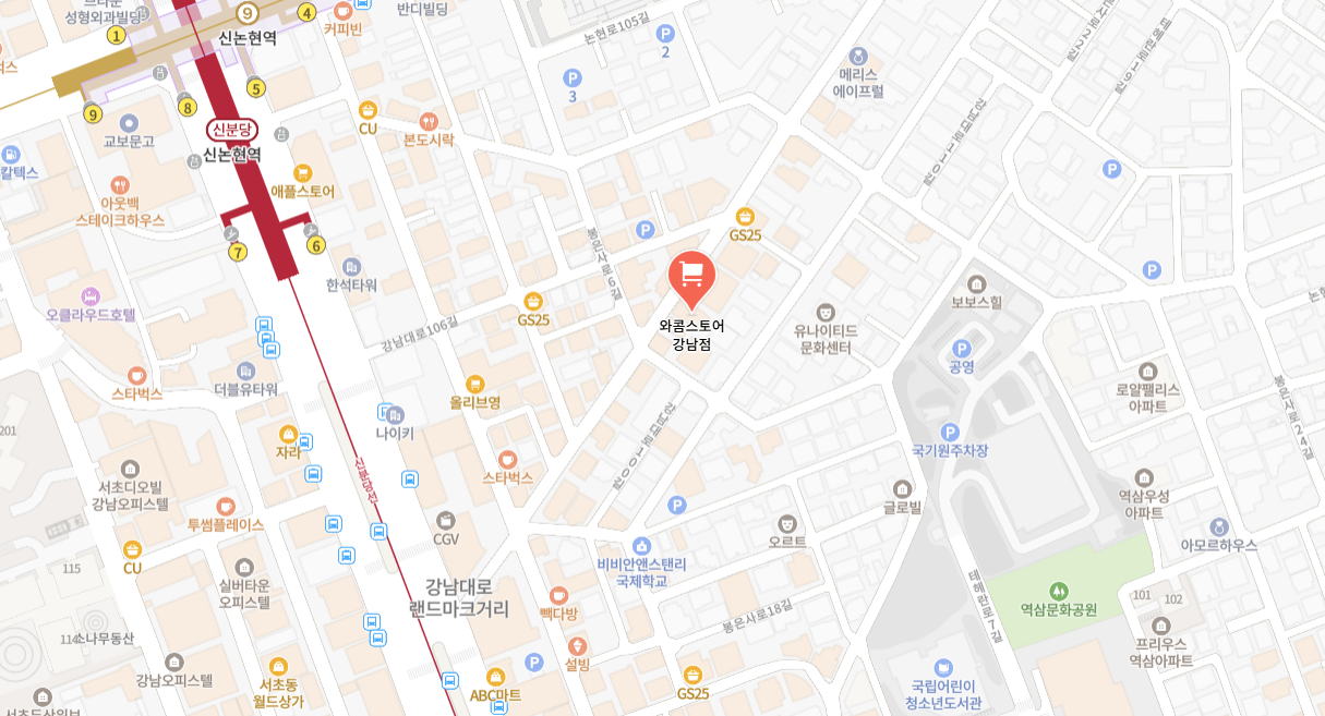 서울 신논현역 6번 출구에서 도보로 약 5분 거리의 와콤스토어 강남점.