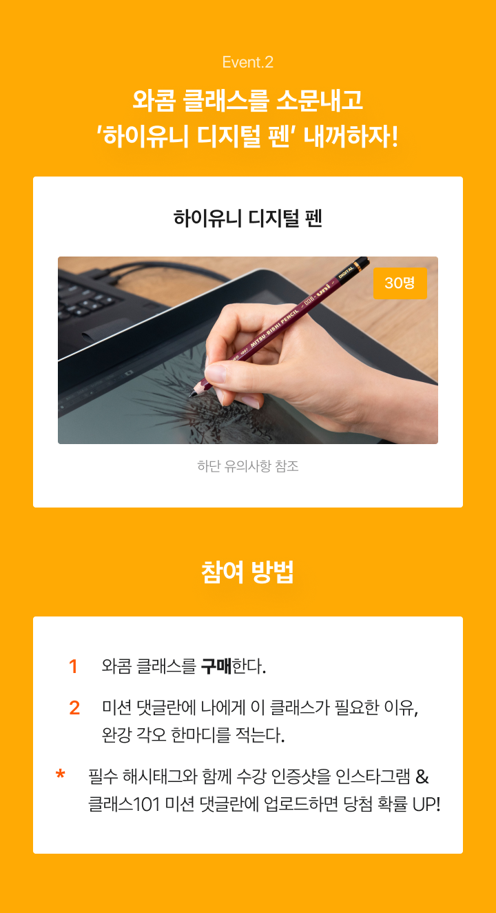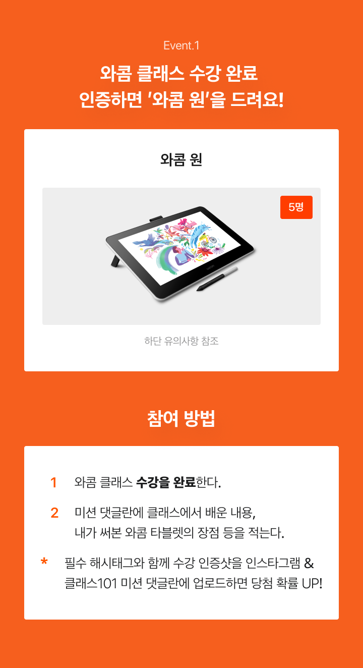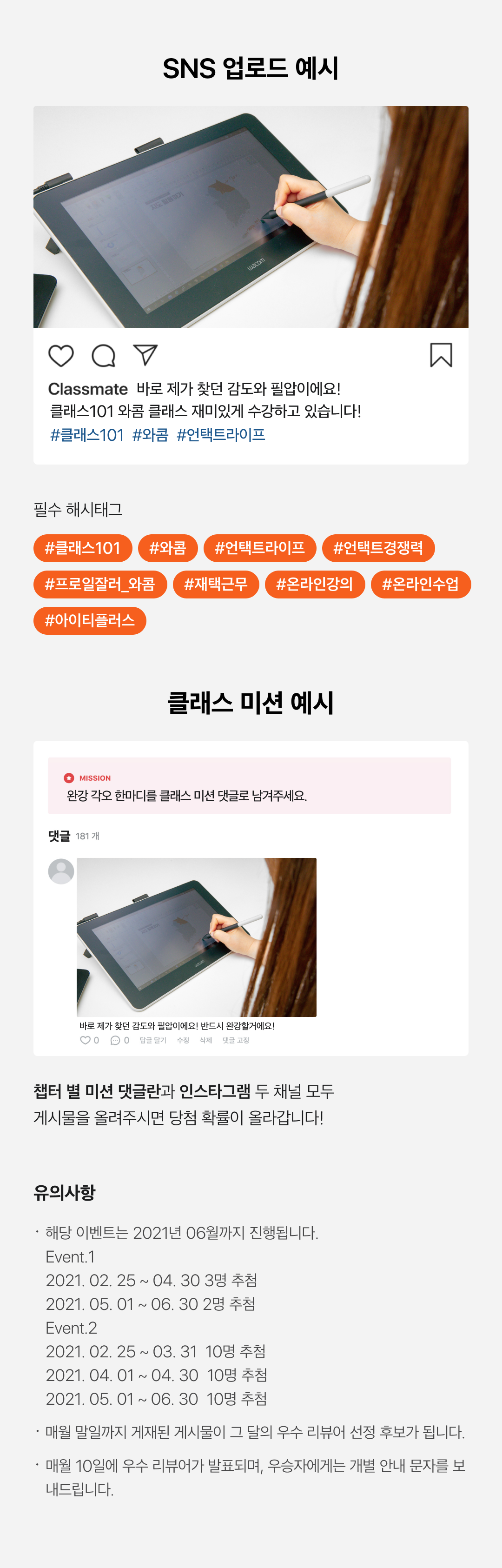 수강 인증샷과 소감, 완강 각오 등을 필수 해시태그 (#와콤 #클래스101 #언택트라이프 #언택트경쟁력 #프로일잘러_와콤 #재택근무 #온라인강의 #온라인수업 #아이티플러스)와 함께 개인 SNS 또는 클래스101 미션 댓글란에 업로드하면 당첨 확률이 높아집니다!