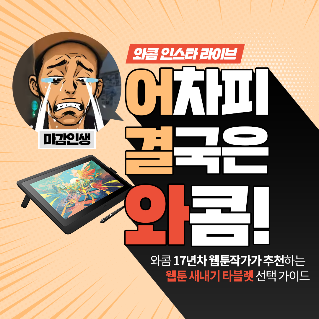 3월 19일(금) 오후 8시에는 유튜버 마감인생(천범식 웹툰작가)와 함께 웹툰 새내기를 위한 타블렛 추천 관련 라이브 방송을 진행합니다. 고등학교를 졸업하고 웹툰 학과, 애니메이션 학과 등에 입학한 신입생들을 위한 라이브 방송인데요. 실제 웹툰작가와 그림 유튜버로 활동하고 있는 천범식 작가가 새내기 웹툰작가에게 딱 맞는 와콤 타블렛을 소개할 예정입니다.