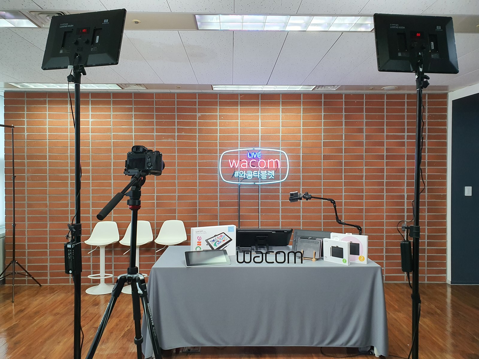 이번 인스타 라이브 방송은 서울 상암동 한국와콤 본사에 새롭게 마련된 와콤 스튜디오에서 진행됩니다. 새롭게 개설된 와콤 스튜디오에는 최신 카메라와 방송 장비, 와콤 타블렛 전 모델 등이 구축되어 있는데요, 라이브 방송과 영상 제작에 최적화된 공간입니다.