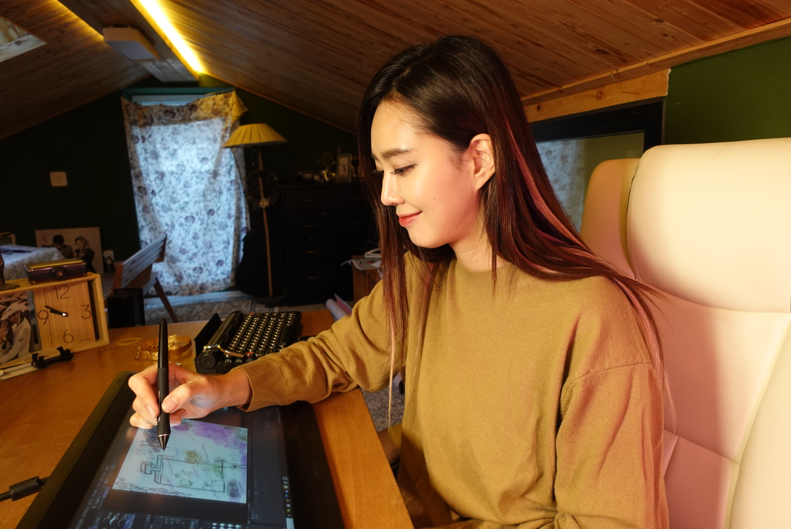 A. 코로나19로 외출이 어려워지면서 집 안에서 다양한 취미 활동을 즐기고 있어요. 최근에는 와콤 신티크16과 클립스튜디오 툴을 활용해서 디지털 드로잉, 디지털 캘리그라피를 시작했어요. 저는 원래 그림을 정말 못 그렸는데, 와콤 타블렛과 그림 소프트웨어로 디지털 드로잉을 해보니까 그림에 흥미가 생기더라고요.