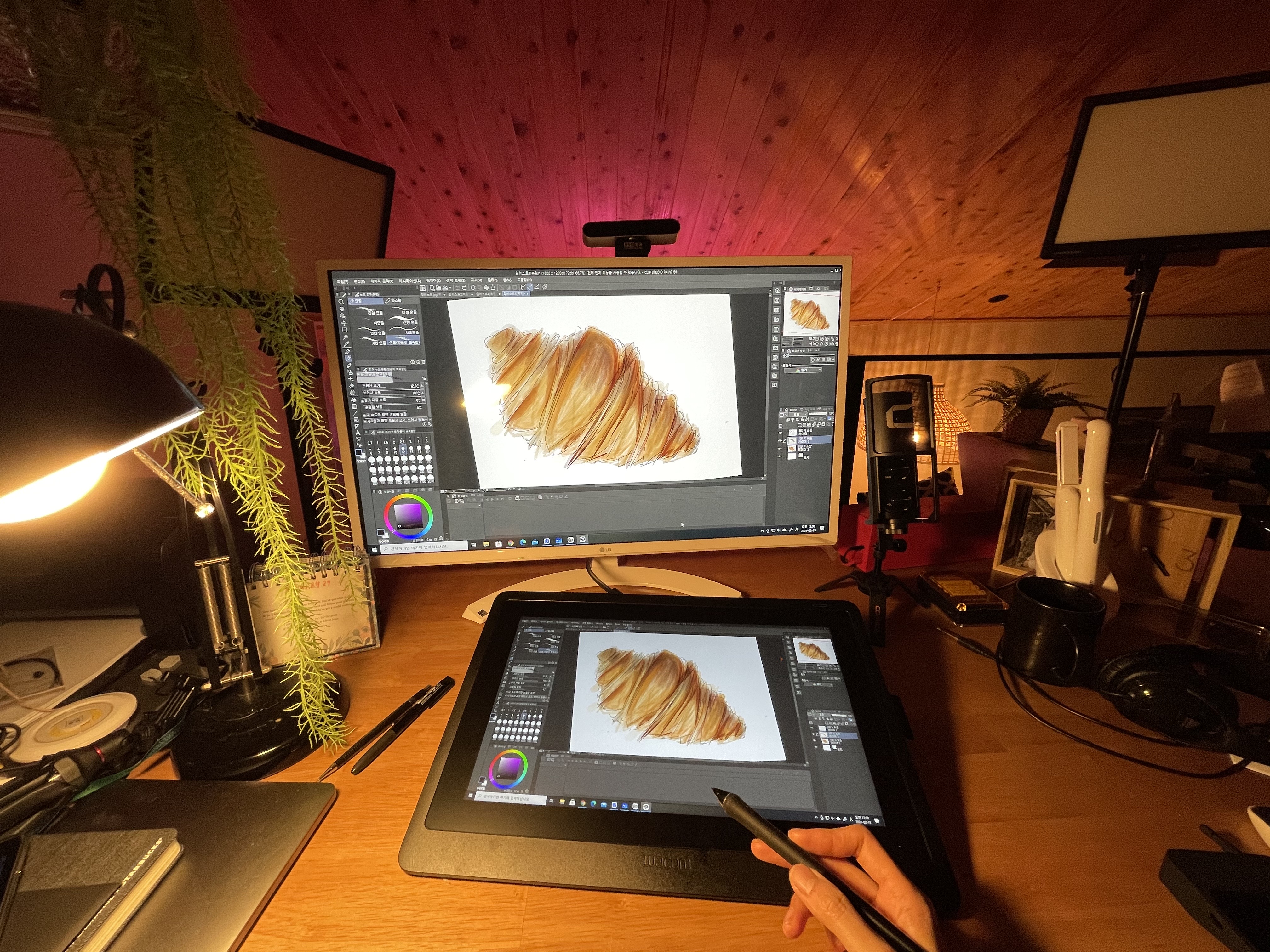 A. 집에서 나만의 작품을 만들 때 다양한 분야에서 와콤 신티크16을 사용하고 있어요. 취미생활로 디지털 드로잉을 시작하면서 제 일상이 좀 더 재미있어졌어요. 제가 만들려고 하는 화장품 브랜드의 향을 표현하는 일러스트를 제작하거나 그림을 그리는 과정을 타임랩스 영상으로 만들고, 포토샵으로 유튜브 썸네일을 만들기도 해요. 최근에는 라이브커머스를 시작해서 라이브 방송을 녹화하고 편집하는 작업도 하고 있습니다. 마우스로 표현하기 어려웠던 것들도 스타일러스 펜과 와콤 타블렛으로 작업하면 훨씬 쉽게 고퀄리티로 작업물을 만들 수 있어요.