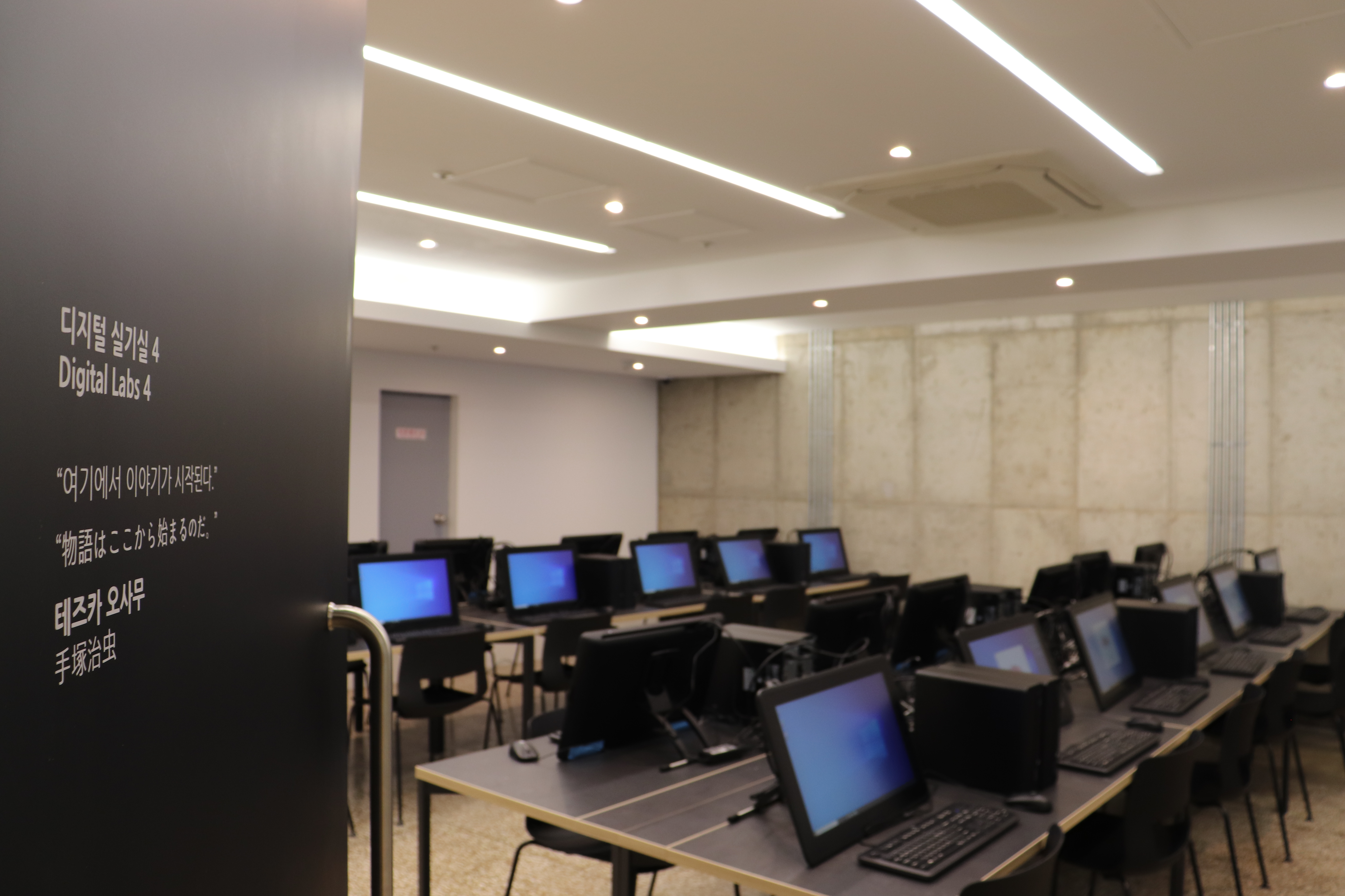 학생들에게 최상의 웹툰 교육 환경을 제공하고자 실제 웹툰 작품 활동을 하는 작가들로 구성된 강사진과 멘토 구성 외에도, 서울웹툰아카데미가 가장 심혈을 기울인 부분은 장비 도입입니다. 고성능 웹툰 창작 장비인 액정타블렛 와콤 신티크22 총 130대가 디지털실기실 4곳에 전면적으로 구축돼 있어 학생 1명당 1대의 와콤 타블렛으로 작업할 수 있는 환경을 마련했어요. 와콤 신티크22는 실제 웹툰 작가들이 가장 선호하는 화면 사이즈인 22형 크기인 데다가, 각도 조절에 용이한 스탠드 기본 장착, 프로급 제품과 동일한 ‘와콤 프로펜 2’가 탑재된 모델입니다.
