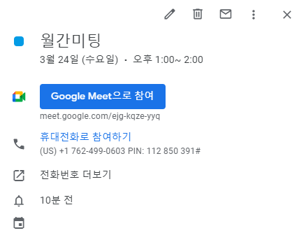 구글 캘린더를 사용하는 분들은 캘린더를 추가/수정하면서 구글 미트를 이용한 회의를 바로 생성 가능합니다. '참석자 추가' 버튼을 클릭한 후 회의에 같이 참석할 사람을 캘린더에서 추가하면, 따로 URL이나 코드를 전달할 필요 없이 회의 정보를 알릴 수 있는데요, 캘린더에 추가 후 'Google Meet으로 참여' 버튼을 누르면 바로 회의에 참석할 수 있습니다.