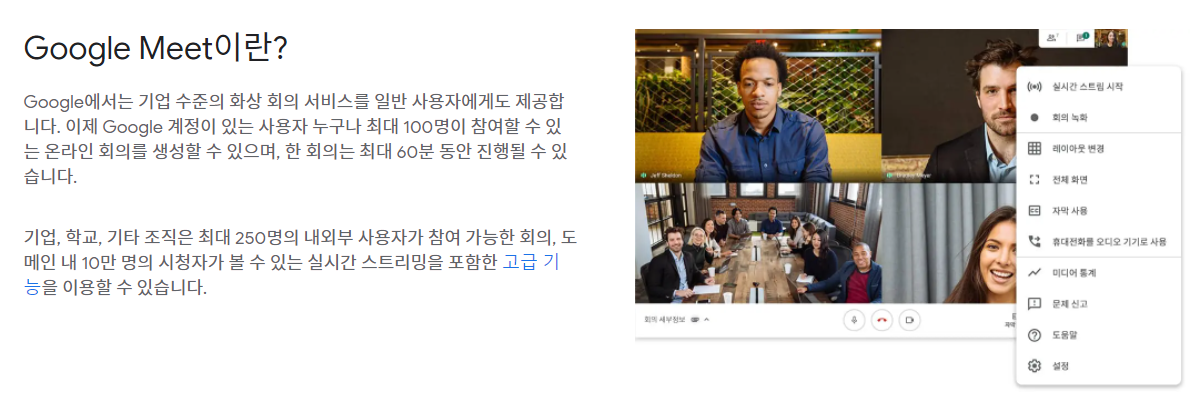 구글 미트는 구글의 행아웃 미팅이 리브랜딩 된 것으로, 2020년 5월 출시되었습니다. 구글 계정이 있는 사용자 누구나 쉽게 사용할 수 있다는 점에서 접근성이 매우 높은 프로그램입니다. 데스크탑과 노트북, 태블릿, 핸드폰 등 OS 상관 없이 모든 기기에서 사용 가능할 뿐만 아니라 별도의 설치가 필요 없고, URL 또는 PIN 코드만 있으면 바로 회의에 접속할 수 있어서 편리합니다. 최대 100명이라는 많은 인원을 수용하기 때문에 대규모 회의도 문제 없답니다.
