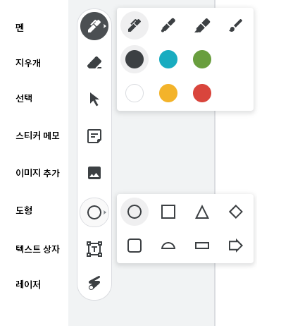 레이저는 펜처럼 화면에 표시가 가능하지만, 그대로 남지 않고 몇 초 후에 사라집니다. 발표자가 이목을 집중시키는 순간에 사용하기 좋은데요, 이외에도 스티커 메모를 추가하고, 도형과 텍스트를 삽입하는 등 여러 작업이 가능하니 목적에 맞게 잼보드를 사용해 보세요!