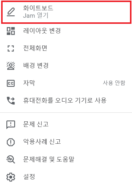 구글 미트의 오른쪽 상단에 있는 메뉴를 클릭해서 잼보드를 열어 주세요. 새로운 보드를 열 수도 있고, 기존의 보드를 드라이브에서 선택할 수도 있습니다.