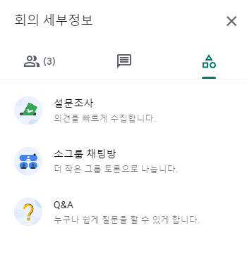 우측 상단에 위치한 아이콘을 클릭하면, 현재 진행 중인 회의 안에서 더 작은 그룹을 위한 새로운 채팅방을 만들 수도 있고, 설문조사와 Q&A 기능을 통해 다른 참여자들의 의견을 빠르게 받아볼 수 있습니다. 소그룹 채팅방은 타이머 기능을 설정하여 일정 시간이 지나면 자동 종료되니, 시간 제한을 두고 아이디어를 내야 하는 상황에서 유용하게 쓸 수 있답니다.