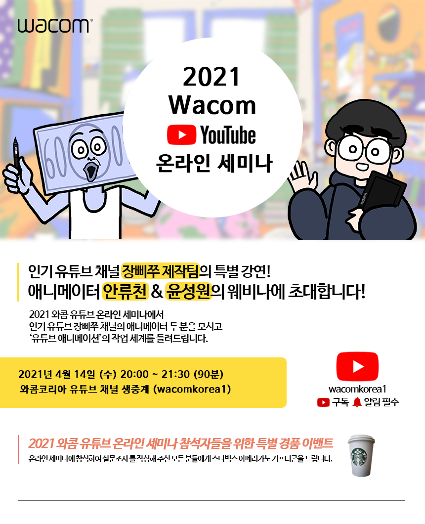 와콤 유튜브 온라인 세미나는 오는 14일 오후 8시부터 9시 30분까지 와콤 공식 유튜브 채널에서 실시간 방송되며, 채널 구독 및 알림 설정을 해 두면 세미나가 시작될 때 알림을 받을 수 있어요. 온라인 세미나를 시청한 후, 설문조사를 완료한 전원에게 스타벅스 커피 기프티콘의 행운이 기다리고 있으니, 이벤트도 놓치지 마세요!