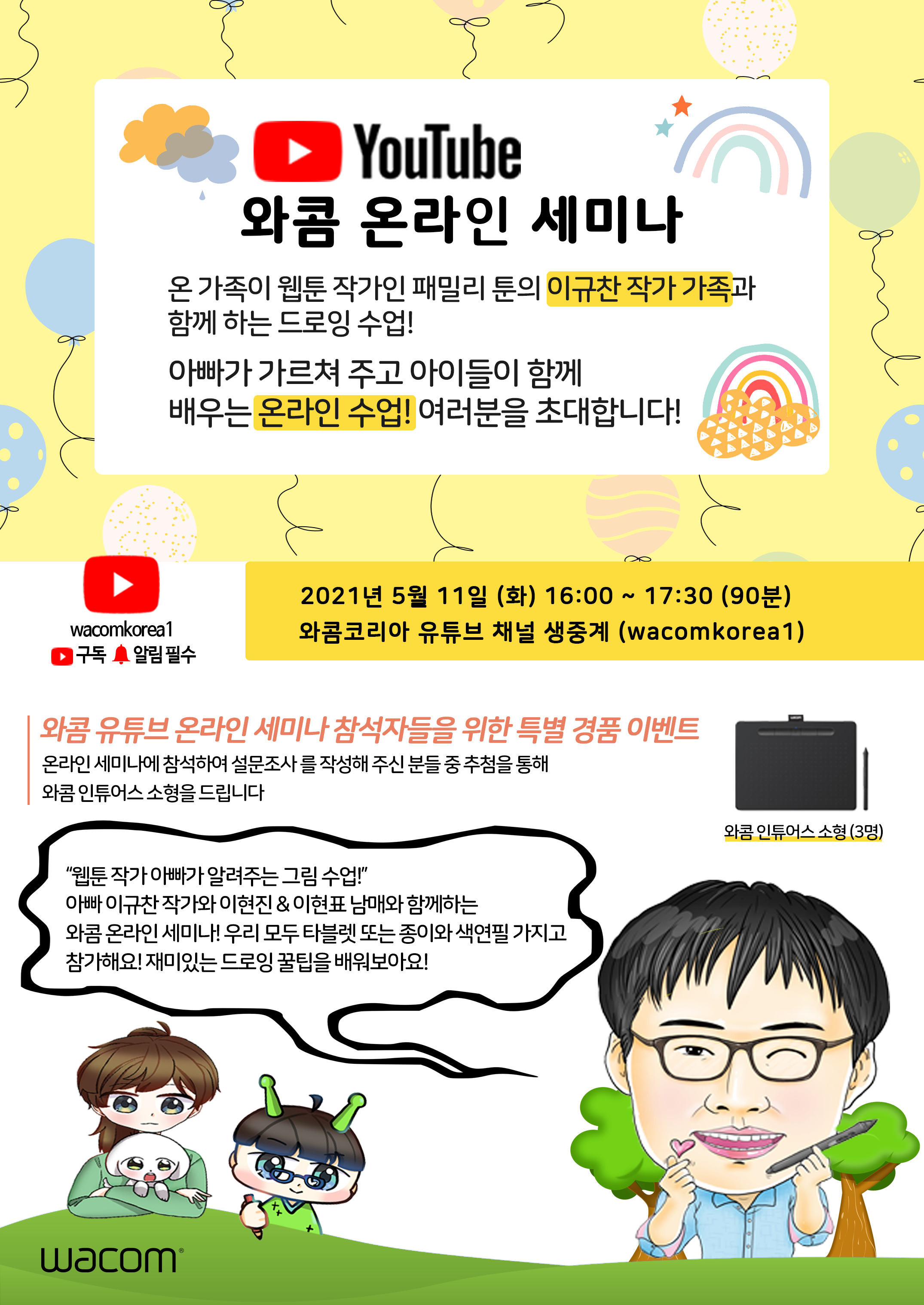 5월은 가정의 달! 디지털 드로잉에 관심이 있는 분들이라면 주목해주세요. 오는 5월 11일 오후 4시부터 5시 30분까지 와콤이 공식 유튜브 채널에서 90분간 온라인 세미나를 개최합니다. 유튜브 실시간 라이브로 진행되며, 타블렛 보유 여부와 상관 없이 디지털 드로잉에 관심 있는 누구나 참여 가능합니다.