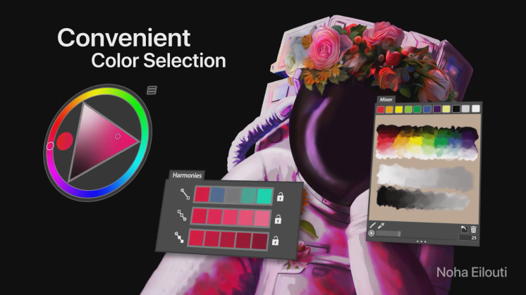 더욱 조화로워진 색 조화는 페인팅 컬러를 쉽게 선택하도록 도와줍니다. 색상을 선택하면 보색과 단색을 포함한, 균형 잡힌 컬러 스와치가 생성되는데요. 그레이스케일, 피부 색, 파스텔 색상 세트를 클릭 한 번으로 선택할 수 있답니다.