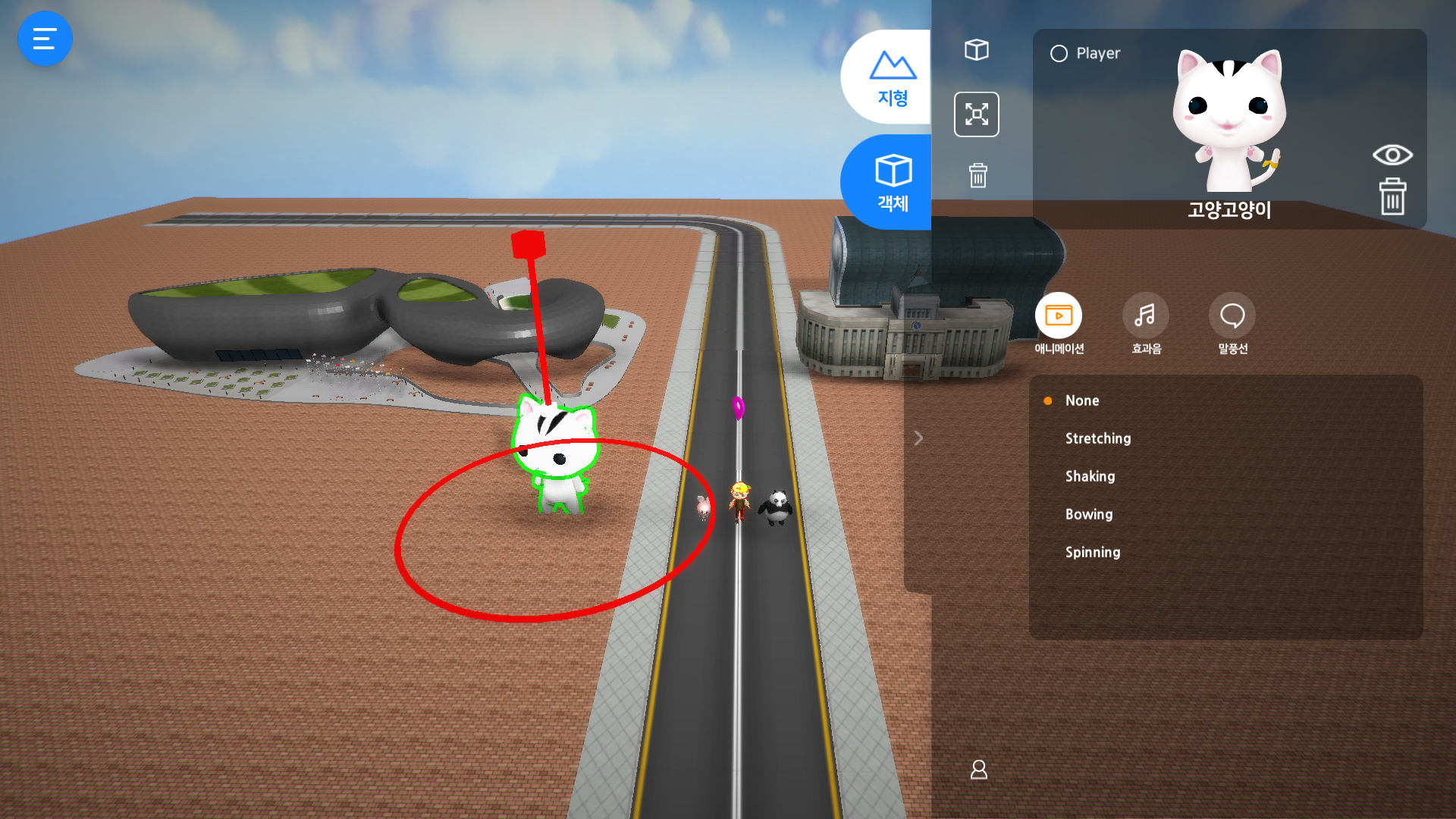 객체 메뉴에서는 캐릭터, 건물, 공룡, 이벤트 등의 오브젝트(객체)로 맵을 꾸밀 수 있습니다. 땅 색상을 변경하고, 도로를 깐 뒤 동대문디지털프라자(DDP)와 서울시청 건물을 불러왔습니다. 땅 색깔이 바뀌고 건물이 들어서니 산과 바다가 보이던 위의 사진과 매우 달라 보이지만, 전부 다 직접 만든 것이랍니다.