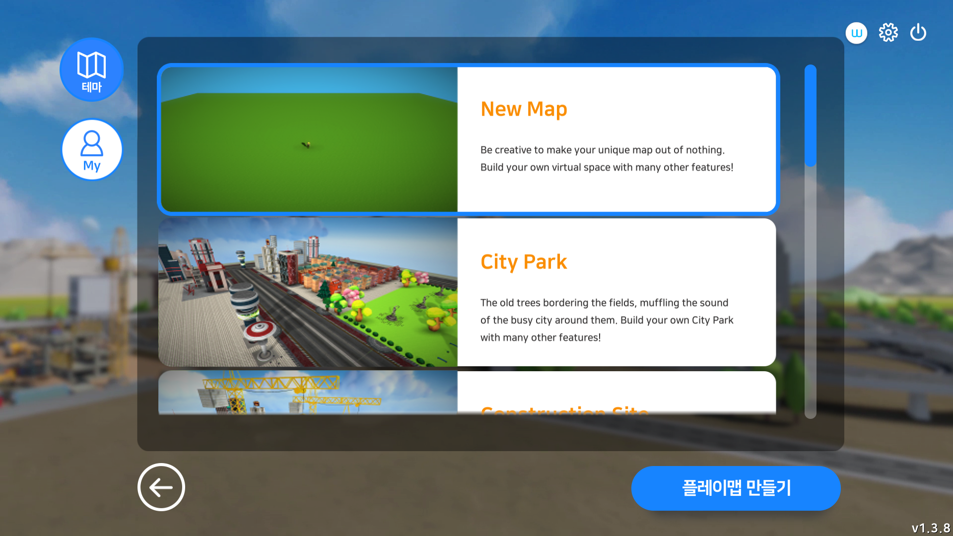 VR Maker 메뉴에서 내가 원하는 테마의 맵을 제작해볼까요? New Map을 클릭하면 아무 것도 없는 기본 상태에서 내 의견이 100% 반영된 나만의 VR 맵을 만들 수 있습니다. 이외에도 도심 공원이나 공사장, 사막, 우주 정거장, 공룡 시대 등의 총 12종의 기존 맵을 원하는대로 커스텀할 수도 있어요.