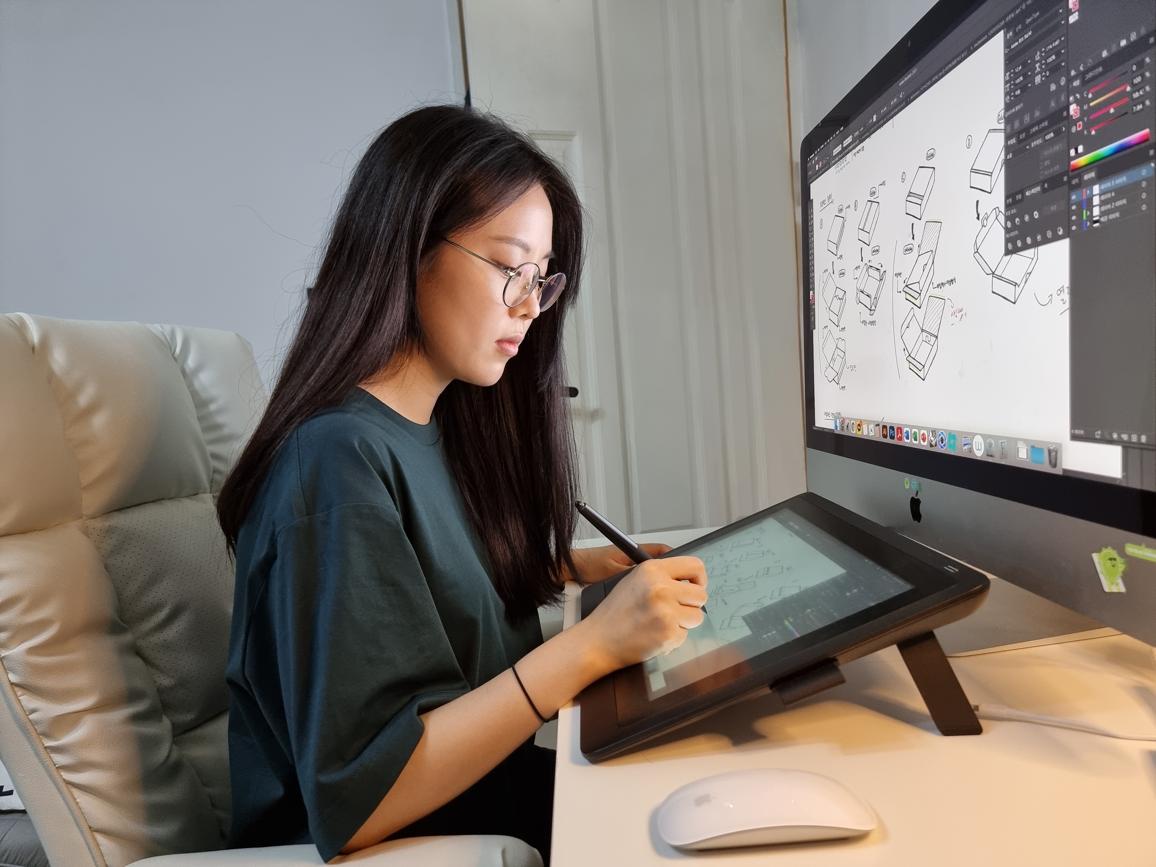 A. 디자인 작업 시 설계가 필요한 경우 3D 작업을 할 때가 있는데요. 3D 모델링 작업은 화면을 회전 혹은 확대, 축소하며 작업물의 상태를 확인해야 합니다. 마우스가 아닌 펜으로 액정타블렛 화면에 직관적으로 작업하면서, 작업 시간이 단축됐던 경험이 있습니다.