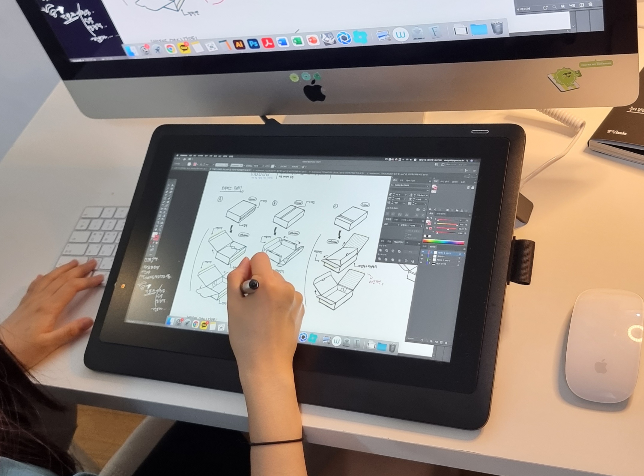 최근에는 온라인 시장이 확대되면서 택배 배송 중에도 제품을 안전하게 운반할 수 있는 튼튼한 지기 구조를 짜기 위해 심혈을 기울이고 있어요. 내부 회의는 물론이고, 외부 업체와 아이디어를 전달하고 실시간으로 작업물을 공유하기 위해서 아날로그 방식보다 디지털 환경에서 대부분의 작업이 이루어진답니다.