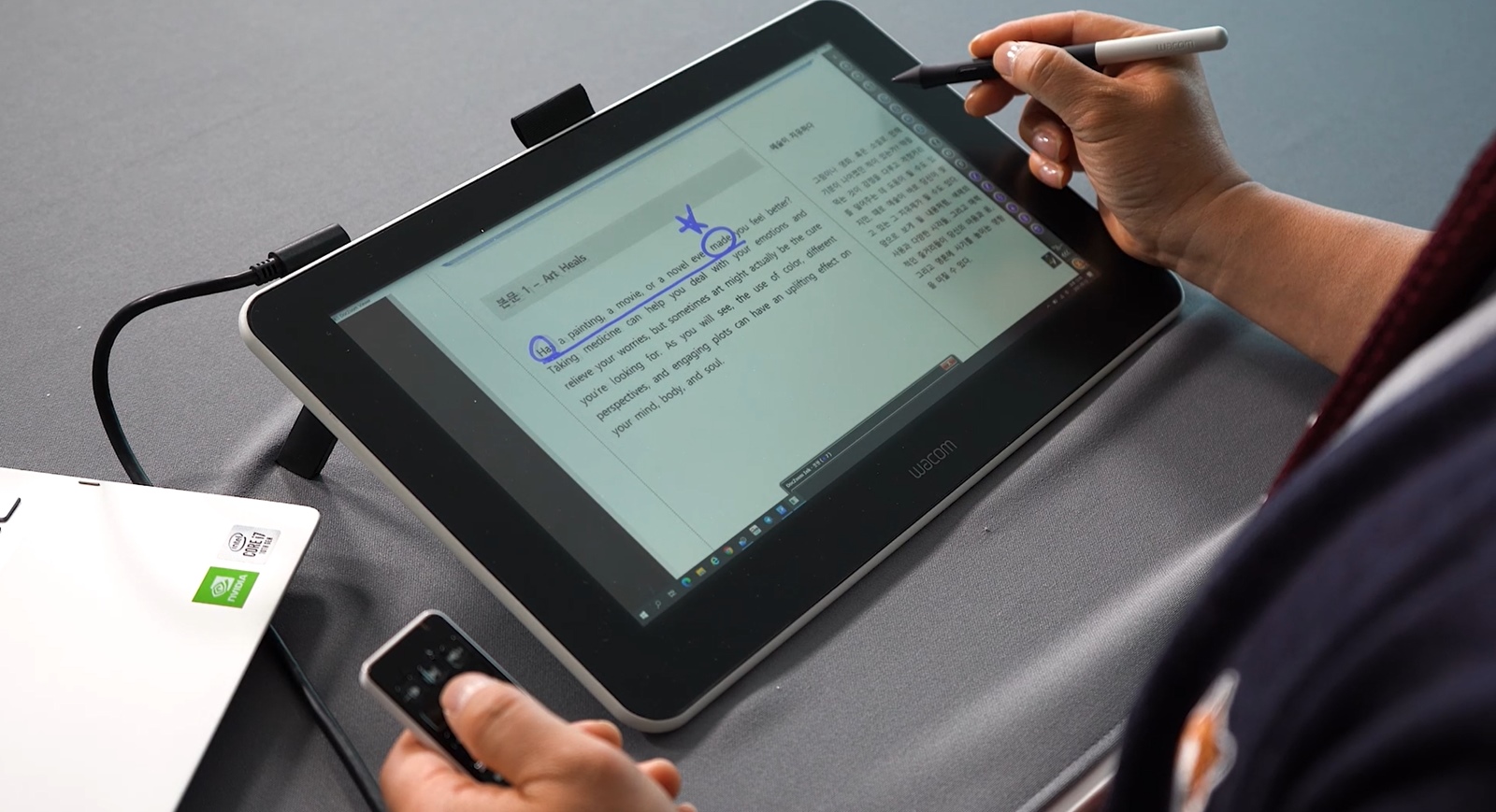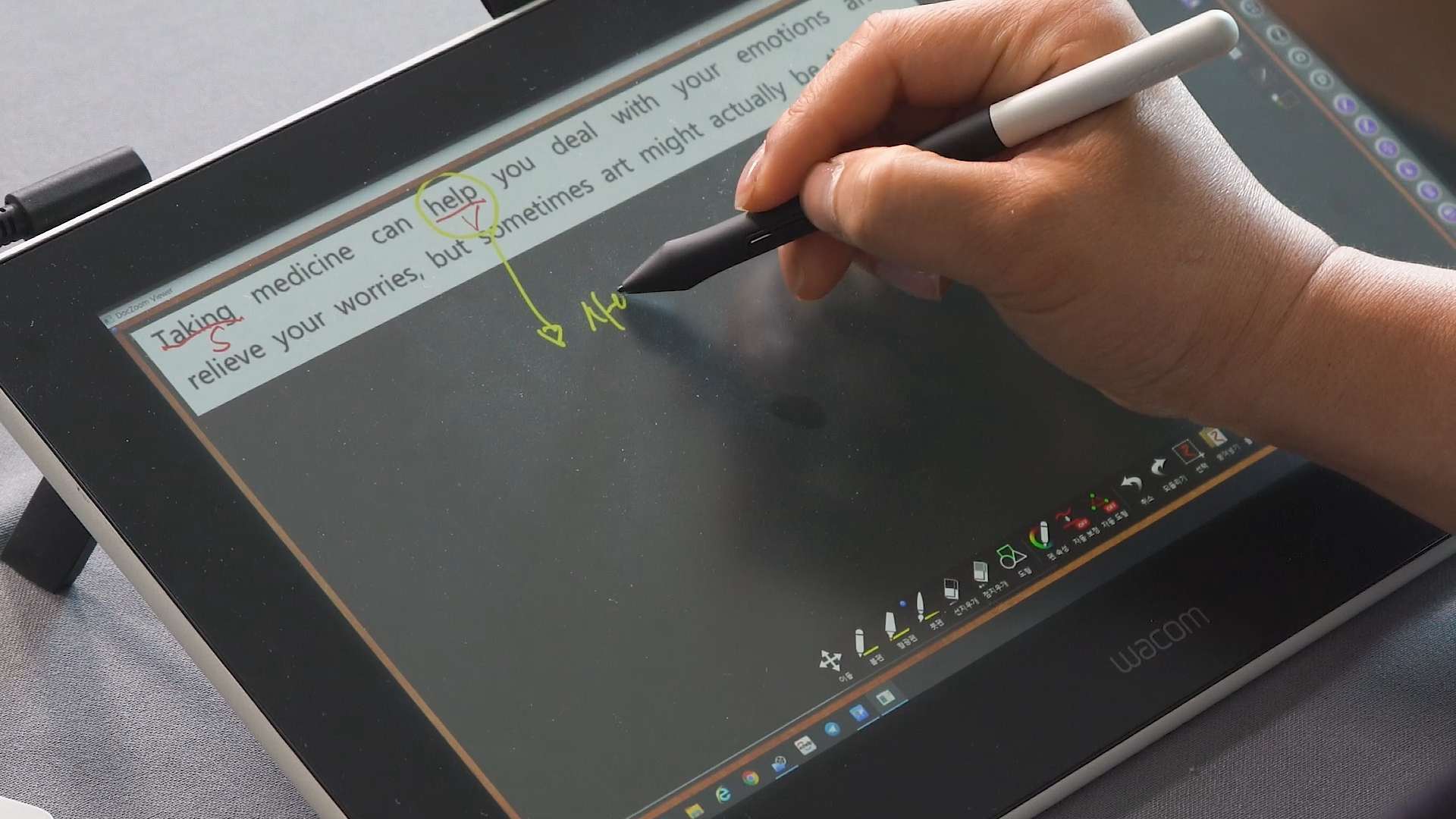 와콤 원에 닥줌을 사용하면, 수업 교재 위에 직관적인 판서를 하거나 필기 내용이 담긴 디지털 파일을 손쉽게 다룰 수 있어요. 확대와 축소는 기본이고 파일을 저장해서 보관하고 공유할 수도 있답니다.