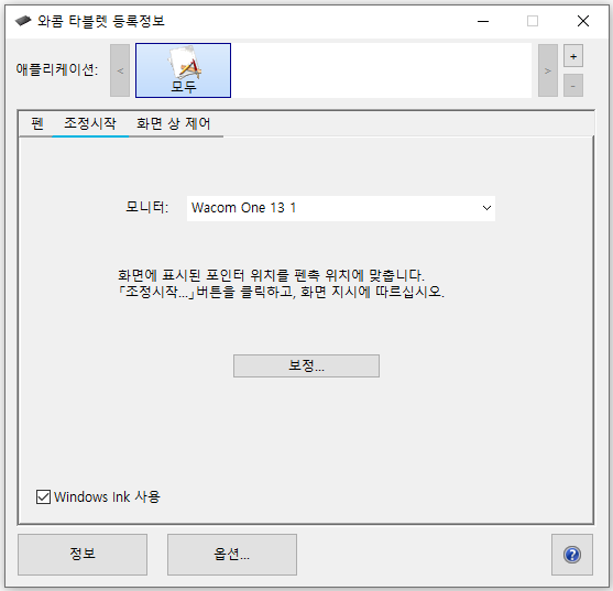 또한 와콤 원 펜을 사용하면서 내가 원하는 곳을 터치했는데도 제대로 인식이 되지 않는다면, 조정 시작 탭에 들어가서 포인터 위치를 보정하여 펜촉 위치에 맞춰주세요.