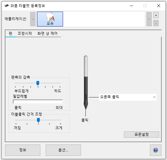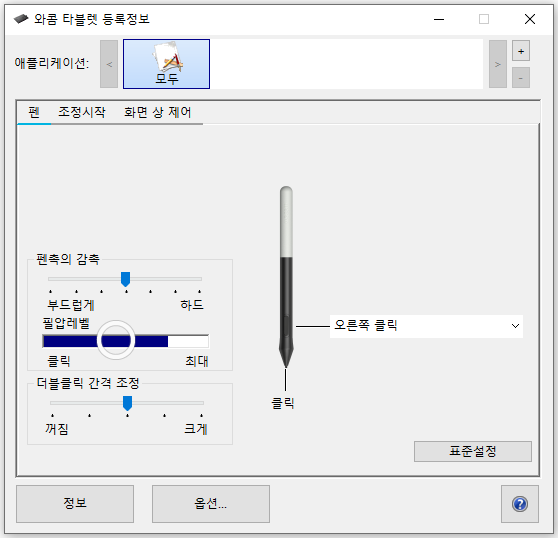 펜 설정 메뉴를 누르면 와콤 타블렛 등록정보 창이 뜨는데요, 해당 페이지에서는 펜촉의 감촉 설정, 필압 레벨 체크, 더블클릭 간격 조정 등 여러 설정을 변경할 수 있습니다.
