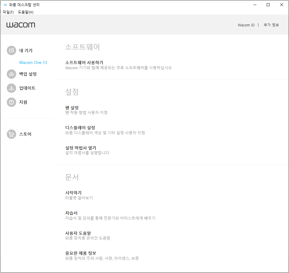 우선 와콤 원을 연결한 후 와콤 데스크탑 센터를 열어주세요. 드라이버를 설치했다면 와콤 데스크탑 센터도 설치되어 있기 때문에, 저장된 경로가 생각나지 않는다면 작업표시줄에 있는 검색창에서 와콤을 검색하면 찾을 수 있습니다.