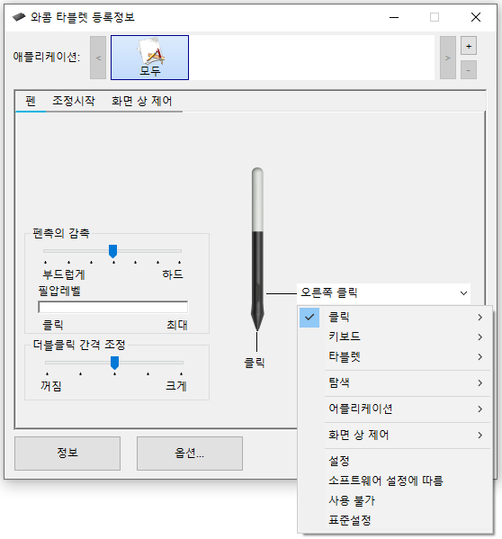 오른쪽 클릭 이외에도 다양한 클릭, 키스트로크, 입력 취소, 지우개 기능 등 다른 기능으로 변경 가능하니 본인의 타블렛 사용 스타일과 맞게 바꿔주면 되겠지요?