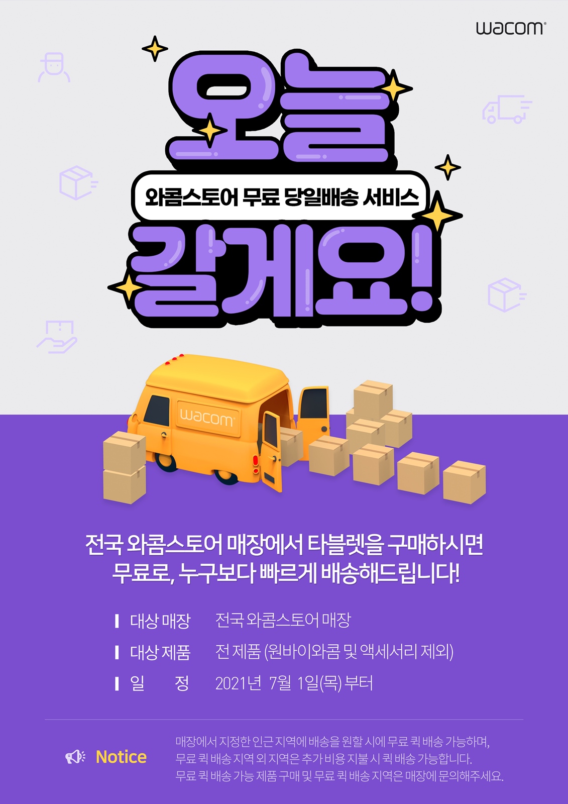 전국 와콤스토어 매장에서 타블렛을 구매하시면 무료로, 누구보다 빠르게 배송해드립니다! 와콤이 2021년 7월 1일부터 전국 와콤스토어 매장 구매 고객에게 무료로 퀵 배송 서비스를 실시합니다.