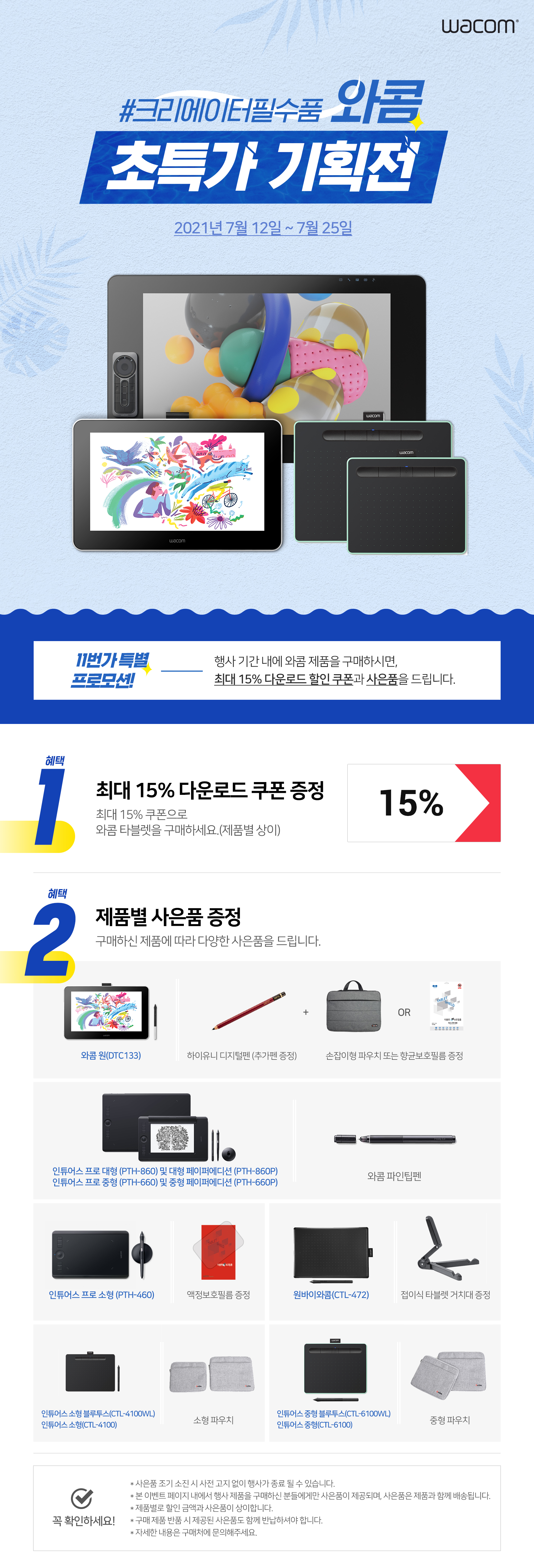 행사 기간 내 11번가의 기획전 이벤트 페이지에서 와콤 원, 와콤 인튜어스, 와콤 인튜어스 프로 등 행사 제품을 구매하면 최대 15% 할인이 가능한 쿠폰 발급 및 구매 모델 별로 다양한 사은품을 받을 수 있는데요, 사은품은 각 구매 제품별로 상이합니다.
