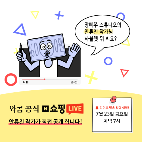 7월 23일 금요일 오후 7시, 와콤이 네이버 쇼핑에서 라이브 커머스 방송을 진행합니다! 이번 네이버 쇼핑 라이브에서는 인기 유튜브 채널 장삐쭈의 애니메이터 안류천 작가가 출연하여 라이브 드로잉 퍼포먼스를 선보이고, 작가가 실제 사용 중인 액정타블렛을 소개할 예정입니다.