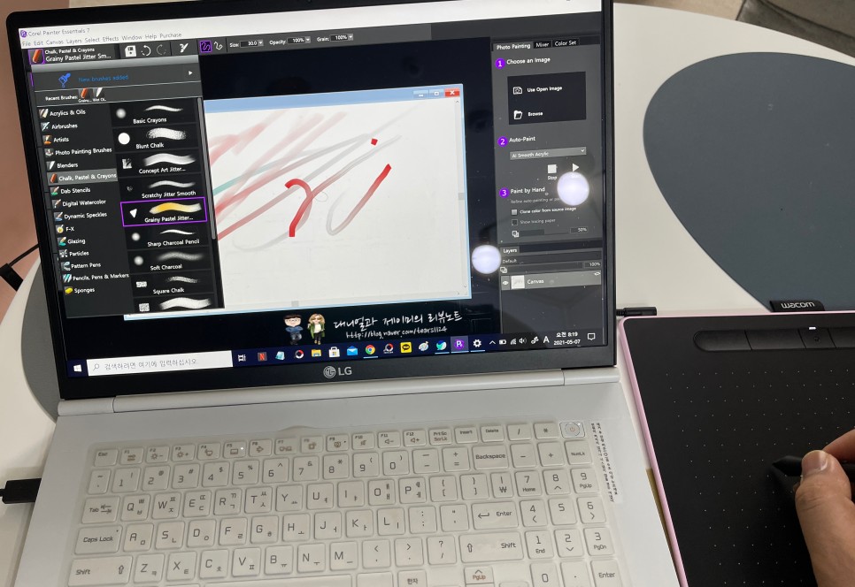 디지털 유화 프로그램의 최고봉이라고 불리는 코렐 페인터 에센셜8으로 브러시 드로잉 연습을 해보았는데요, 포토샵이나 라이트룸과는 비교 되지 않는 섬세한 붓터치 드로잉이 가능했습니다. 4,096 단계의 필압 인식이 가능하고 그립감이 뛰어난 와콤 펜을 사용하면 시너지가 배가 됩니다.