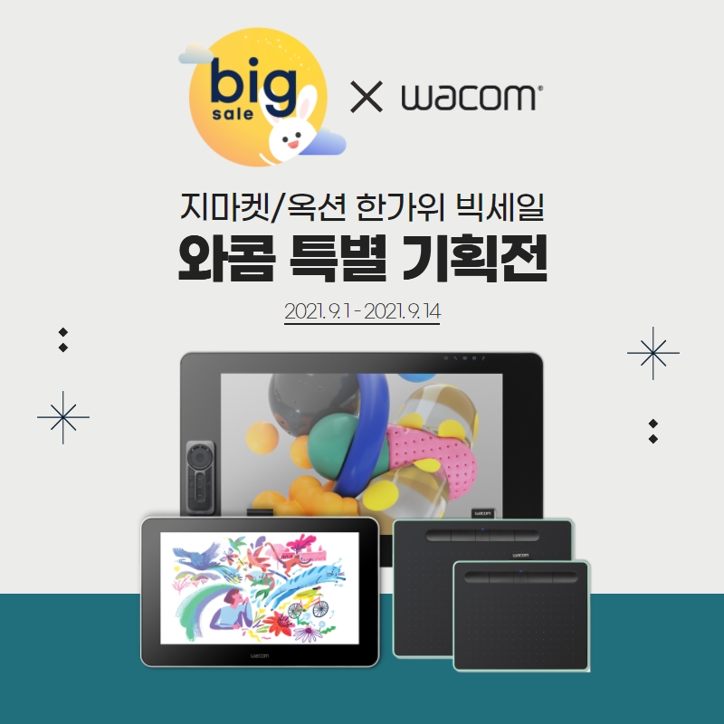 어느새 2021년의 9월이 시작되었습니다. 본격적으로 가을을 맞이하게 된 9월, 우리의 대명절 추석도 얼마 남지 않았는데요, 다가오는 추석을 기념해 지마켓와 옥션에서 한가위 빅세일이 열립니다. 와콤 특별 기획전에서 와콤 타블렛 제품을 만날 수 있는 기회예요!
