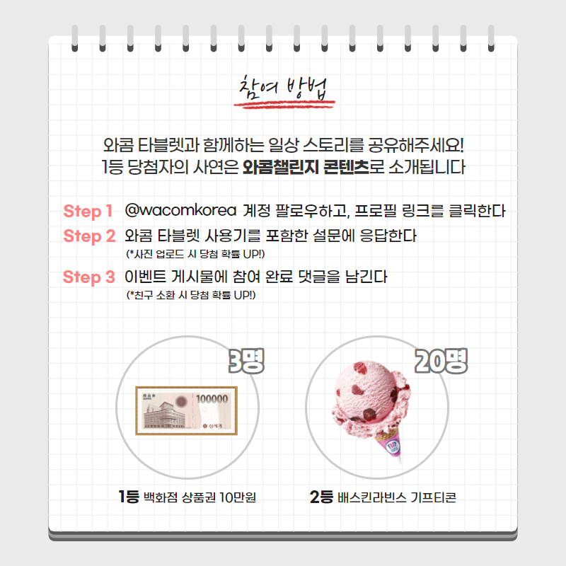 와콤챌린지 사연 모집 이벤트에서 1등으로 선정된 3분에게는 백화점 상품권 10만원권, 2등으로 선정된 20분에게는 배스킨라빈스 아이스크림 기프티콘을 증정하는데요, 해당 이벤트는 1등 당첨 시 와콤챌린지 콘텐츠에 참여한다는 전제 하에 참여 가능합니다. 와콤챌린지에는 얼굴과 본명이 노출되며, 와콤 공식 블로그와 SNS채널에 소개된다는 사실을 인지 부탁드리며, 기존 와콤챌린지 게시물에서 콘텐츠 형식을 확인할 수 있습니다.