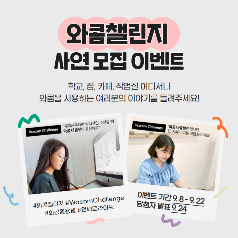 이번 이벤트는 9월 8일(수) 부터 9월 22일(수) 까지 진행되며, 9월 24일(금) 에 당첨자를 발표할 예정입니다. 와콤으로 그림을 그리는 미래의 웹툰작가, 와콤으로 온라인 수업을 하는 모든 선생님, 와콤으로 디지털 필기하는 학생, 와콤으로 디자인하는 금손 디자이너 등 와콤 타블렛 유저라면 누구나 참여 가능해요.
