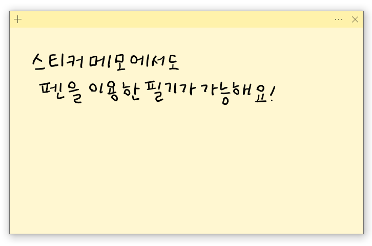 타블렛을 연결하지 않은 상태에서는 마우스로 아무리 스티커 노트 위를 움직여도 흔적이 남지 않지만, 타블렛이 연결된 경우에는 다른 필기 소프트웨어처럼 그 위에 글씨를 쓰거나 그림을 그릴 수 있습니다. 하지만 이미 펜을 이용해서 작성한 스티커 메모 창에는 추가로 텍스트를 등록하는 것은 불가능합니다.
