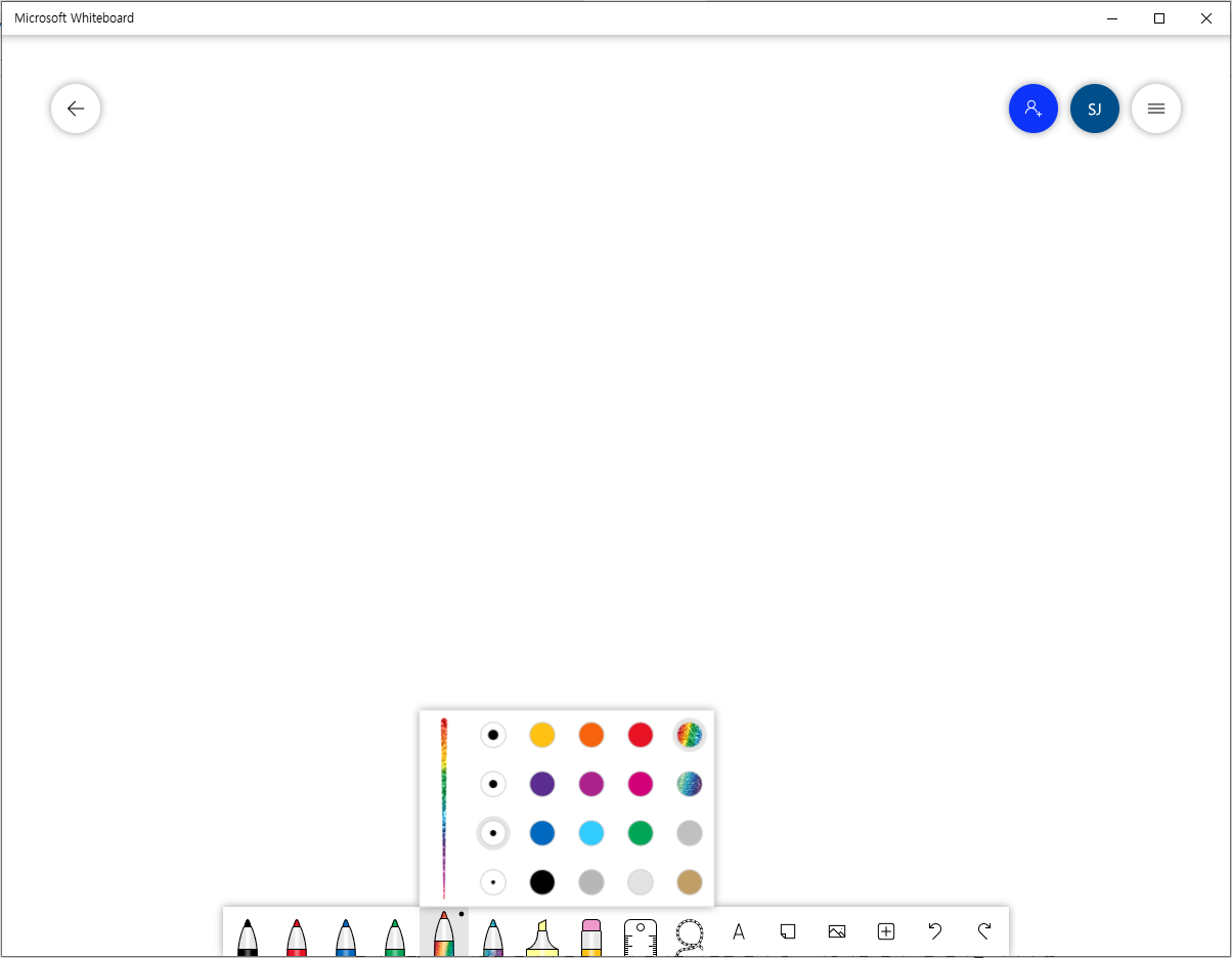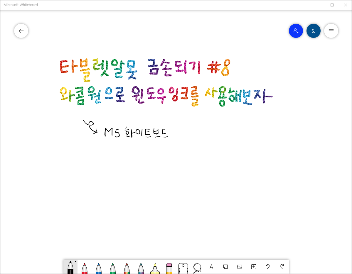 가장 먼저 소개하는 MS 화이트보드는 다양한 색의 펜과 형광펜 기능을 제공해서 펜을 이용해 필기나 드로잉 등의 작업을 할 수 있어요. 펜으로 하는 필기 뿐만 아니라 텍스트나 이미지 삽입도 가능하기 때문에 매우 유용한 프로그램이랍니다.