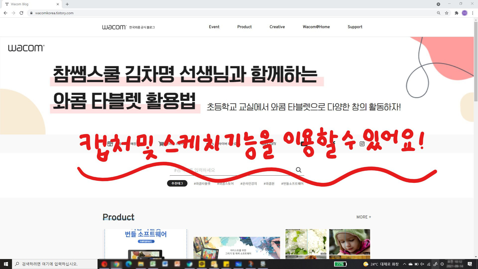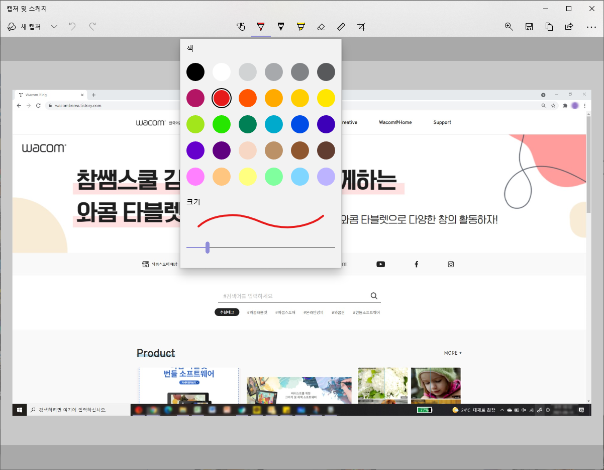전체 화면 캡처 기능을 이용해 와콤 블로그 화면을 캡처해보았습니다. 캡처 앤 스케치 창에서 간단한 필기를 마친 후 저장했는데, 한 번에 캡처와 필기를 할 수 있어서 편리했답니다.