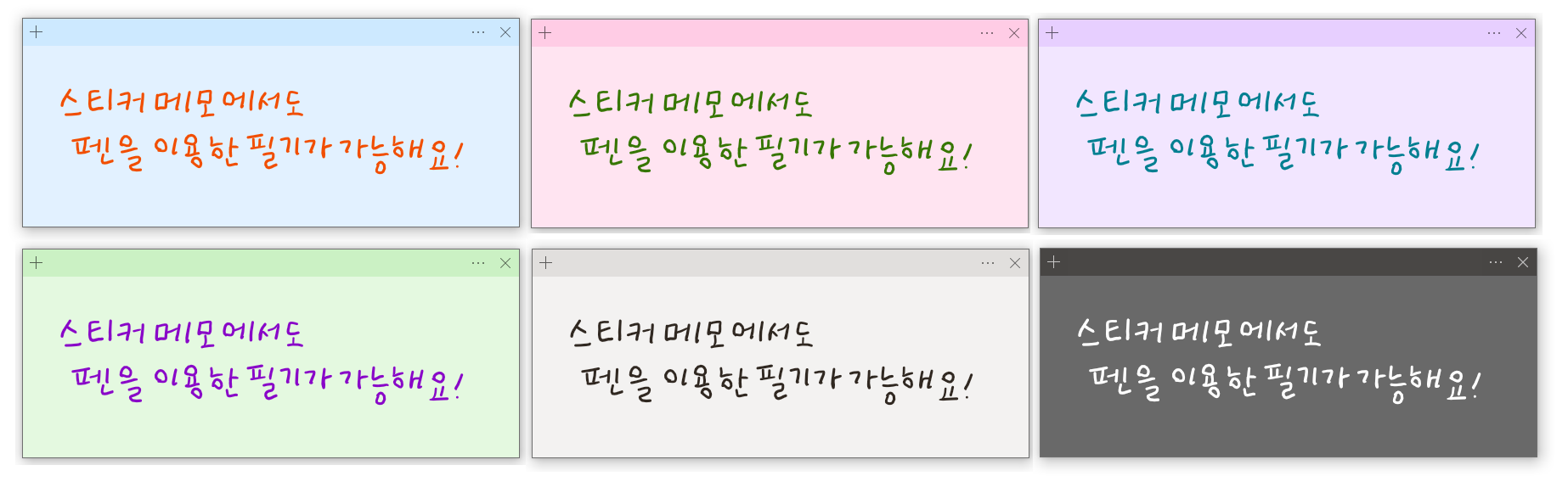 다른 필기 소프트웨어와 달리 펜의 굵기나 유형, 색상 변경, 지우개 등의 기능은 지원하지 않습니다. 하지만 메모 색상을 바꾸면 그에 따라 펜 색상도 같이 바뀌는 것을 확인할 수 있어요. 총 7가지의 메모 색상 중, 마음에 드는 컬러를 선택해서 사용하면 좋을 거예요. :)
