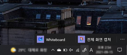 윈도우 잉크 아이콘을 클릭하면 우측 이미지처럼 두 개의 메뉴, 화이트보드(Whiteboard)와 전체 화면 캡처가 뜹니다. 화이트보드는 마이크로소프트(MS)에서 만든 메모 소프트웨어로, 윈도우 유저라면 누구나 사용 가능해요.