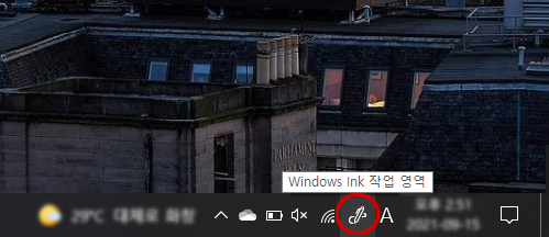 우선 가장 먼저 와콤 원을 PC에 연결하고, 연결이 완료되면 화면의 오른쪽 맨 아래를 확인해주세요. 시작표시줄 위에 윈도우 잉크 아이콘이 등장했습니다. 윈도우 잉크 아이콘은 펜 모양이기 때문에 쉽게 찾을 수 있어요. 아이콘 위로 마우스를 갖다대면 Windows Ink 작업 영역이라는 문구가 뜹니다.