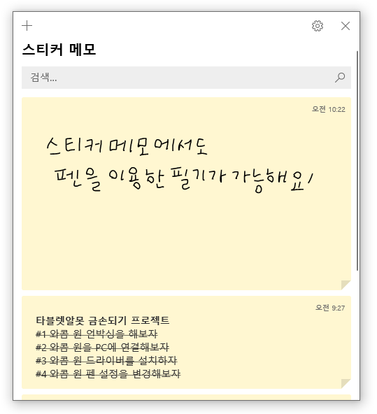 화이트보드와 전체 화면 캡처 외에, 스티커 노트에서도 윈도우 잉크 기능을 사용할 수 있어요. 스티커 노트는 바탕화면에 띄워두고 쉽게 메모를 확인할 수 있어서 많은 사람들이 애용하는 노트 프로그램입니다. 주로 간단한 텍스트 메모를 저장하는 용도로 쓰이지만, 펜을 이용한 필기도 가능해요.